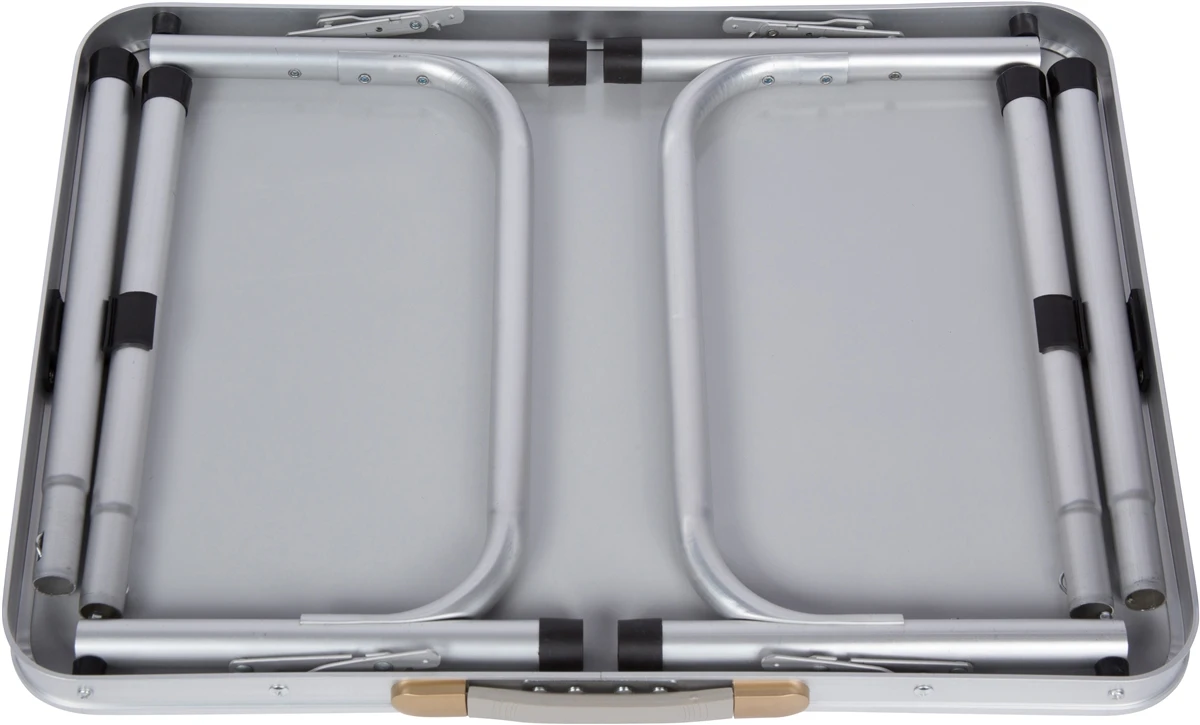 Easily take this table with you to your next tailgate, picnic or camping adventure. Â Made from aluminum, it is lightweight and folds easily down to 23.75″ x 17.5″ x 1.5″. Â The carry handle makes it a snap to transport or store. Â It measures 23.75″L x 17.75″W and the height can adjust from 10.2″ to 22.8″. Â The surface can easily be cleaned with a damp cloth. Â The table surface is MDF. Â Made with quality parts by Trademark Innovations.