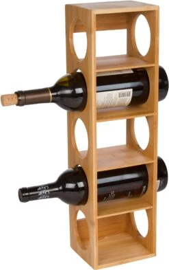 This sleek and simple bamboo wine rack holds 5 bottles of 750ml wine. Â Each rack measures 19.75″L x 5.5″W x 4.75″H and each hole is 3″ in diameter. Made from eco-friendly bamboo which grows at the same rate, or faster, than we use it. Â Stack you wine either vertically or horizontally and use multiple racks to create a large wine display. Â To clean, wipe with a damp cloth. Â By Trademark Innovations.