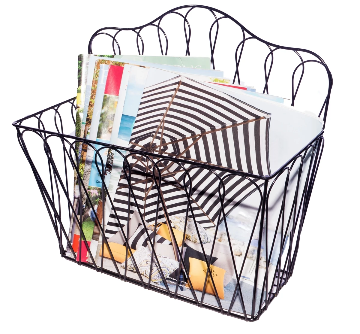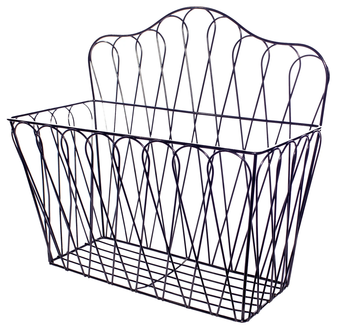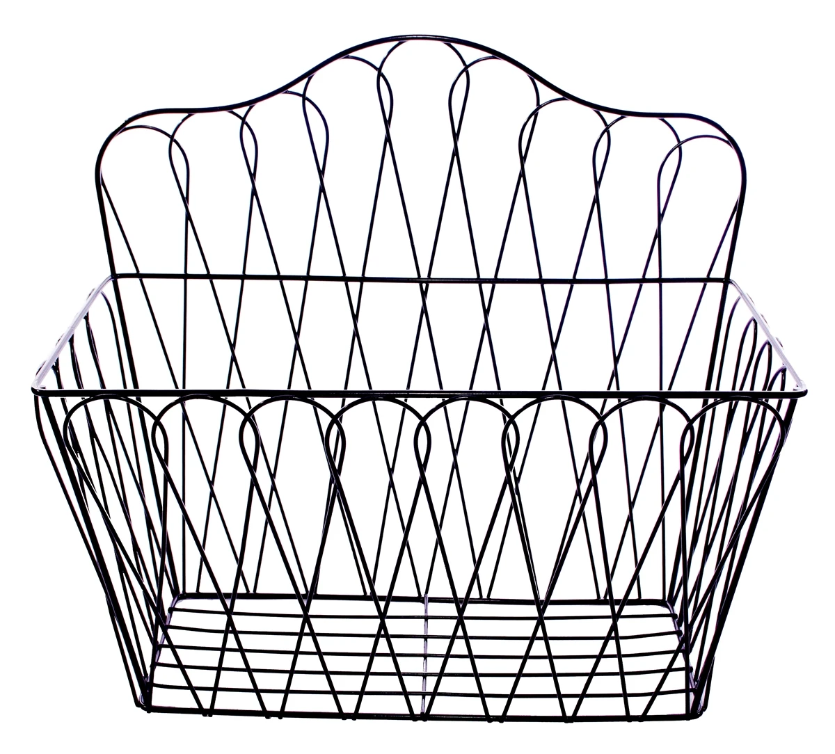 This attractive metalwork magazine rack can be hung on the wall or can stand alone. Â It measures 13.75″L x 6″W x 8″H in the front and 13″H in the back. Â Made of black coated metal, it is sturdy while being stylish. Â Use it for magazines, file folders, as a fruit basket, or to hold hand towels. Â Recommended to use 2 dry wall anchors, one on either end of the rack. Â Hanging hardware not included. Â By Trademark Innovations.