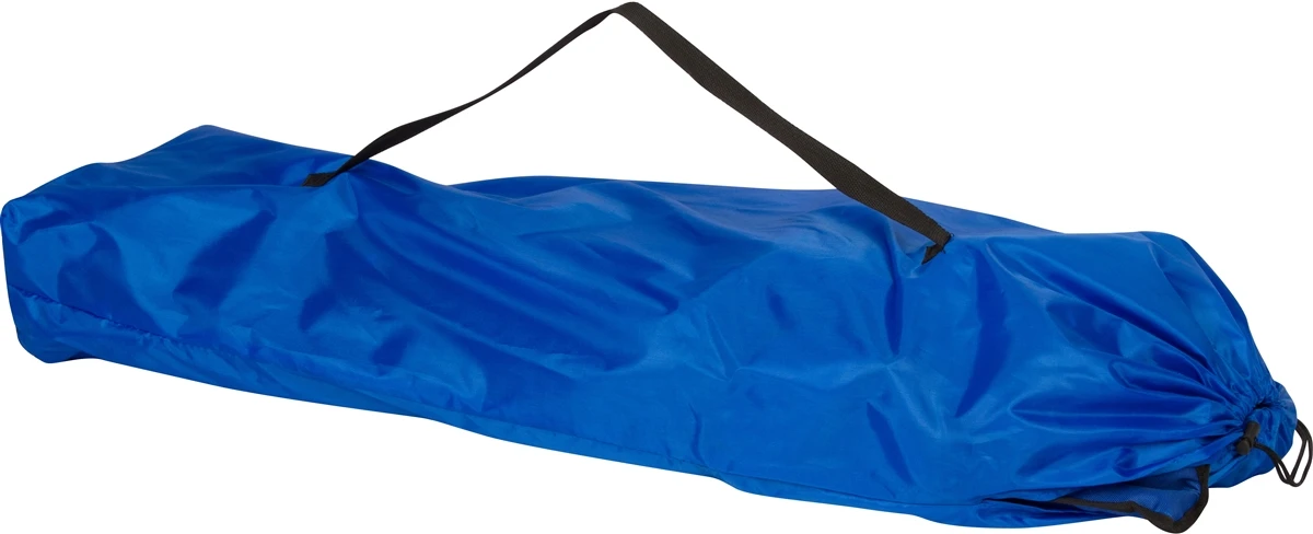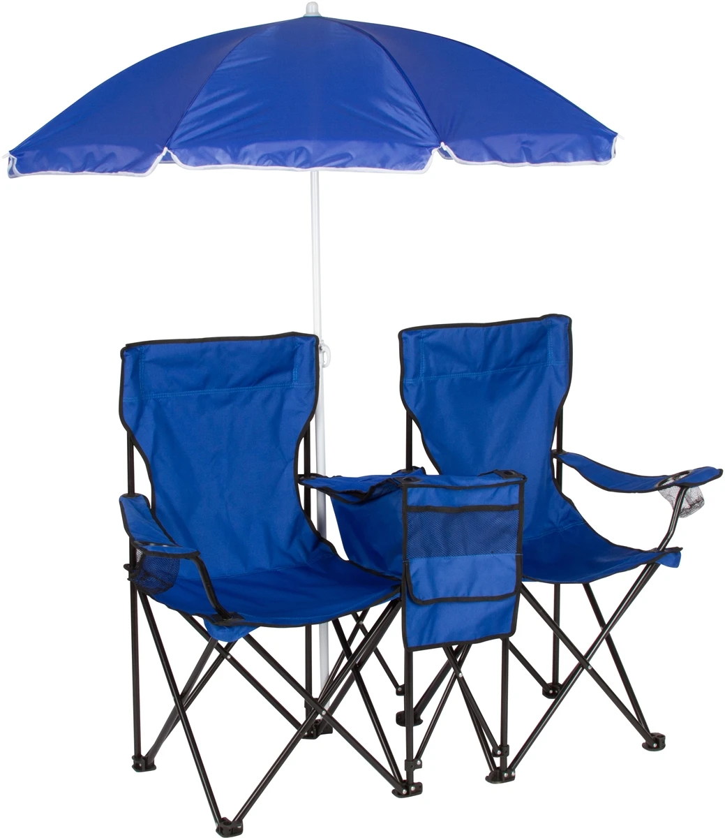 Relax with 2 people in the shade with this double sized camp chair with removable umbrella. Â The overrall chairs measure 52″L x 19″W x 37″H and has a convenient cooler bag. Â The frame is steel tube with black powder coating. Â The fabric is sturdy 600D oxford and 210D for the carry bag. Â The chairs fold for easy transport and storage. Â Take to the beach, camping, picnic or your favorite sporting event. Â By Trademark Innovations.