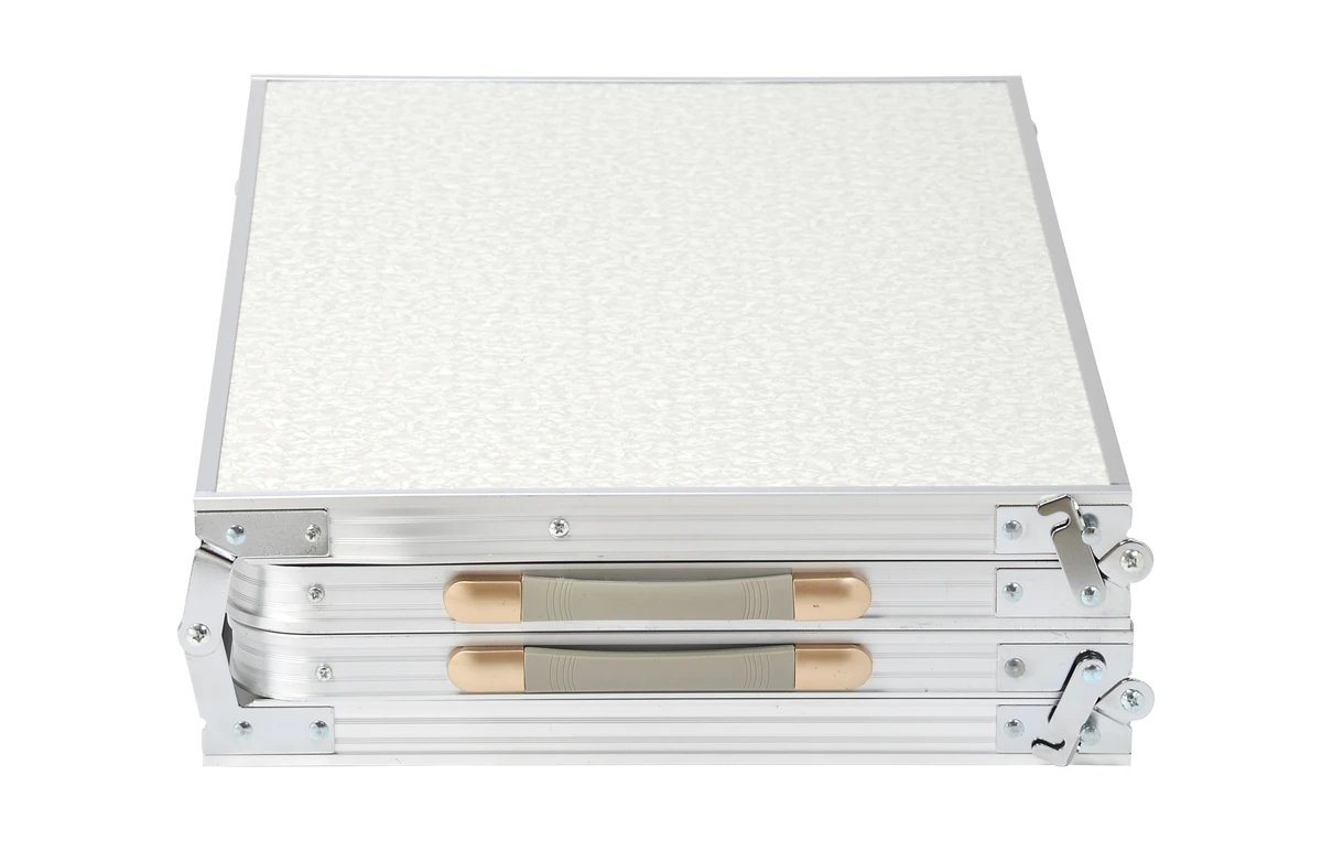 The table folds easily into a suitcase style for easy transport and weighs 20lbs.