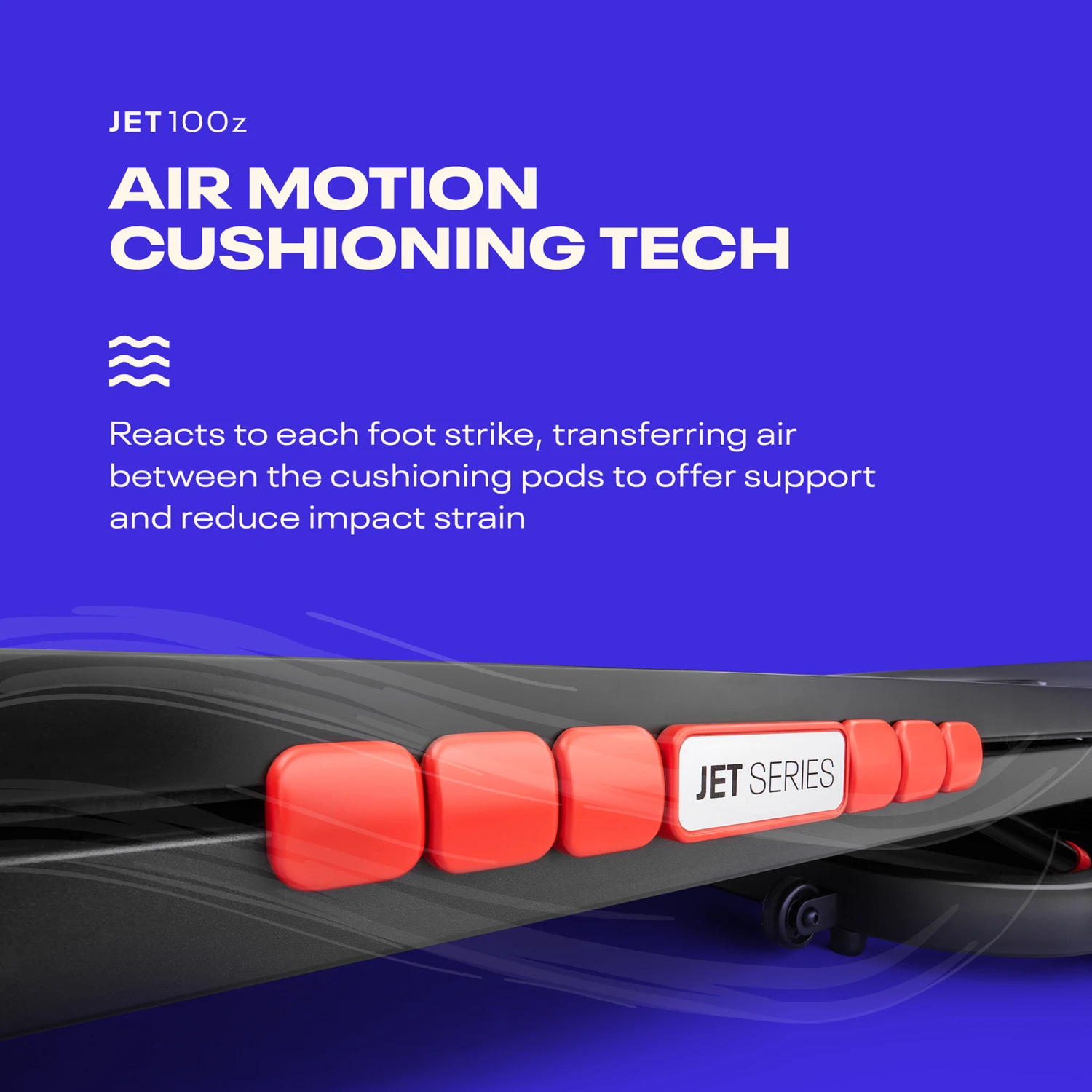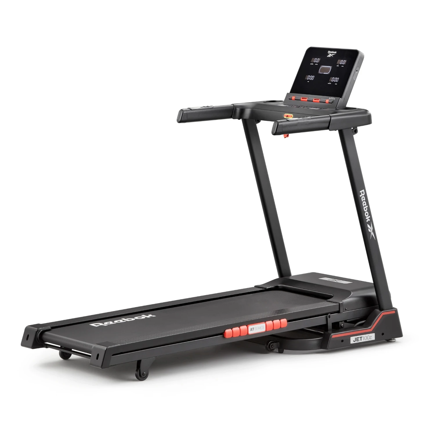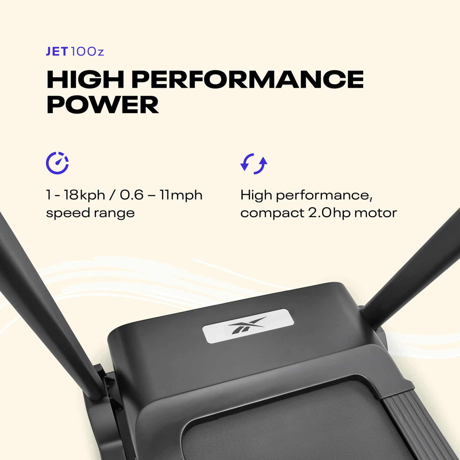 The Reebok Jet 100z Treadmill is ideal for home cardio fitness thanks to its 2.0 Hp motor, which delivers speeds of 1 – 18 km/h (0.6 – 11 mph) across 12 levels of electronic incline. Designed with Air Motion cushioning technology, the Jet 100z reacts to each foot strike, transferring air between the cushioning pods to offer support where it’s needed most. Creating a more stable and forgiving platform, the Air Motion technology brings comfort and performance to your runs. With 24 pre-installed fitness programmes, a custom setting for you to design your own and 3 target programmes, the Jet 100z has plenty of variation to help keep you motivated and ensure you can reach your fitness goals. This can be further enhanced by creating personal workouts and syncing the Jet 100z with Zwift, an immersive online running experience built around a connected global community of runners.