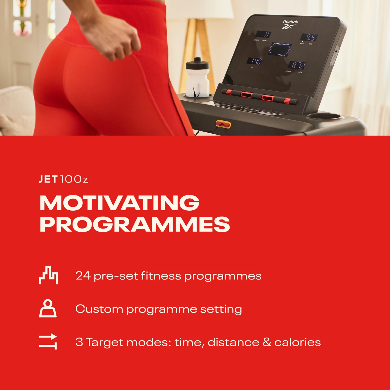 - 24 pre-set fitness programmes, plus one custom setting and target time, distance and calories