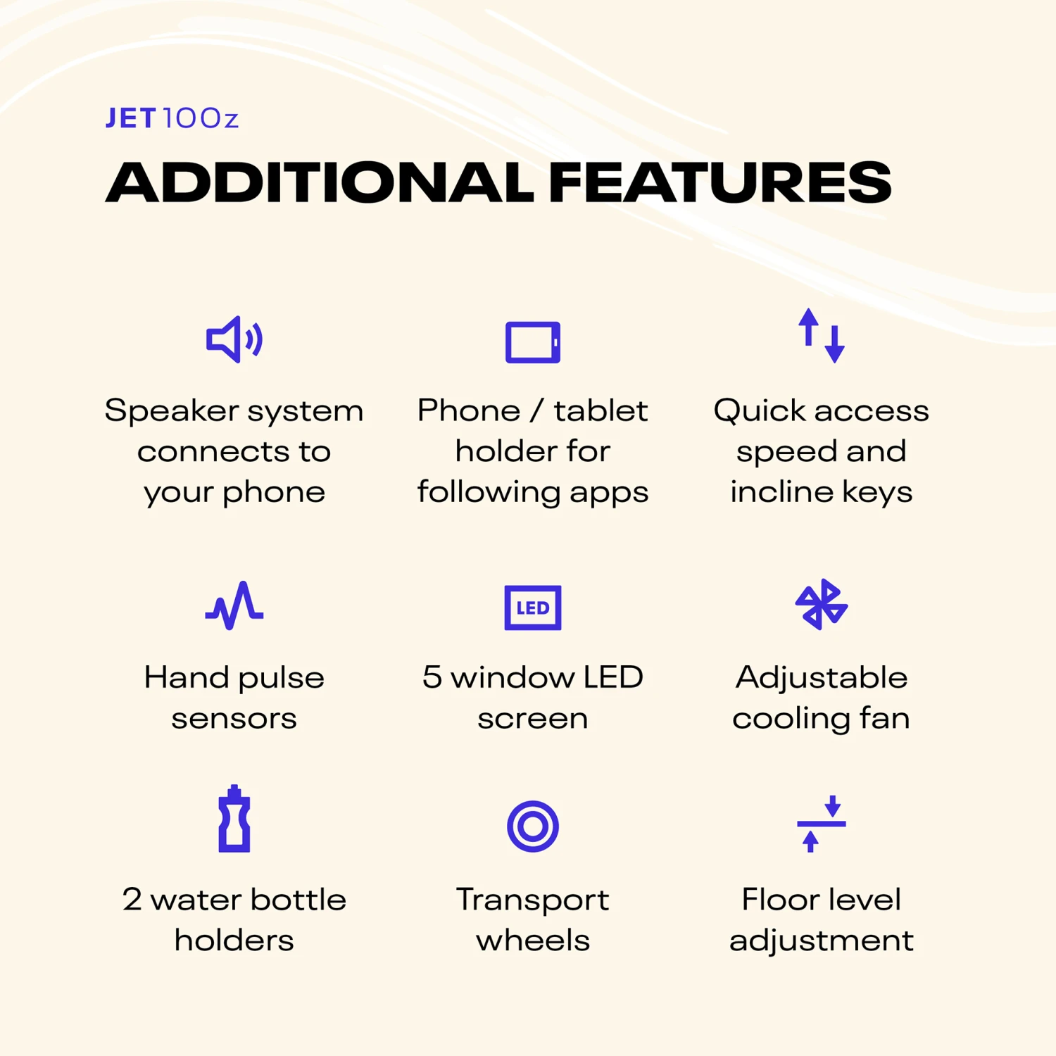 - Floor level adjustment ensures solid grounding and a stable running platform