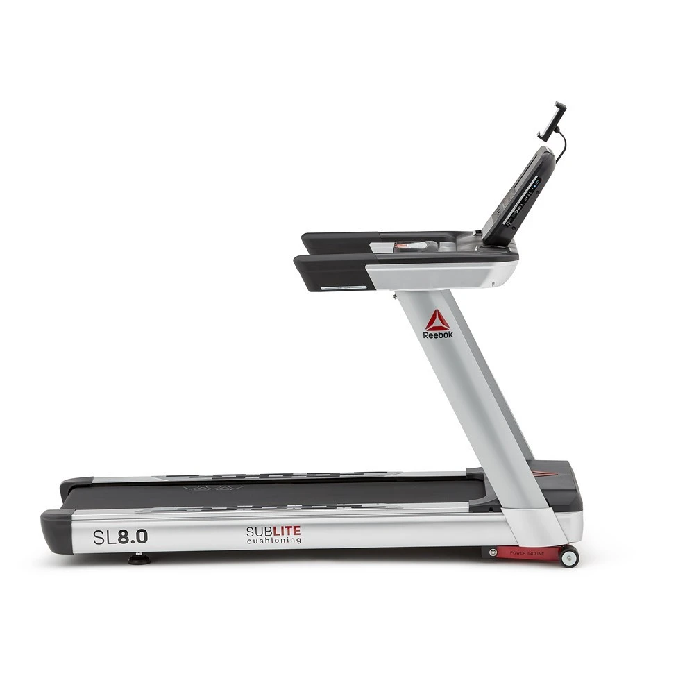 Compatible with the Reebok Fitness App; the console connects to your mobile device to track, plan and analyse your run whilst creating routes through google maps and street view. The SL8.0 also features an adjustable fan to keep you cool whilst the integrated media hub houses auxiliary and headphone ports plus a USB charging station to keep your workouts powered. Designed for total quality and heavy-duty performance, the SL8.0 backs this up with a strong max. user weight of 150 kg – combining a fixed running deck with a spacious running area to create the optimal home running machine. Simple to set up with easy instructions and all tools included, the SL8.0 also features substantial transport wheels for swift movement around the house. Finished with rubberised side rail grips and rubber-lined storage areas, the SL8.0’s attention to detail matches its performance. Reinforced by Reebok’s quality assurance guarantee, the SubLite range comes complete with18-months parts and labour guarantee.