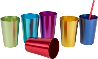 These retro aluminum tumblers are the perfect addition to a summer cookout, beach party or for everyday use. Â Made of non-breakable aluminum, they are perfect for indoor and outdoor use. Hand washing is recommended. Â They come in a variety of rainbow colors. Â By Trademark Innovations.