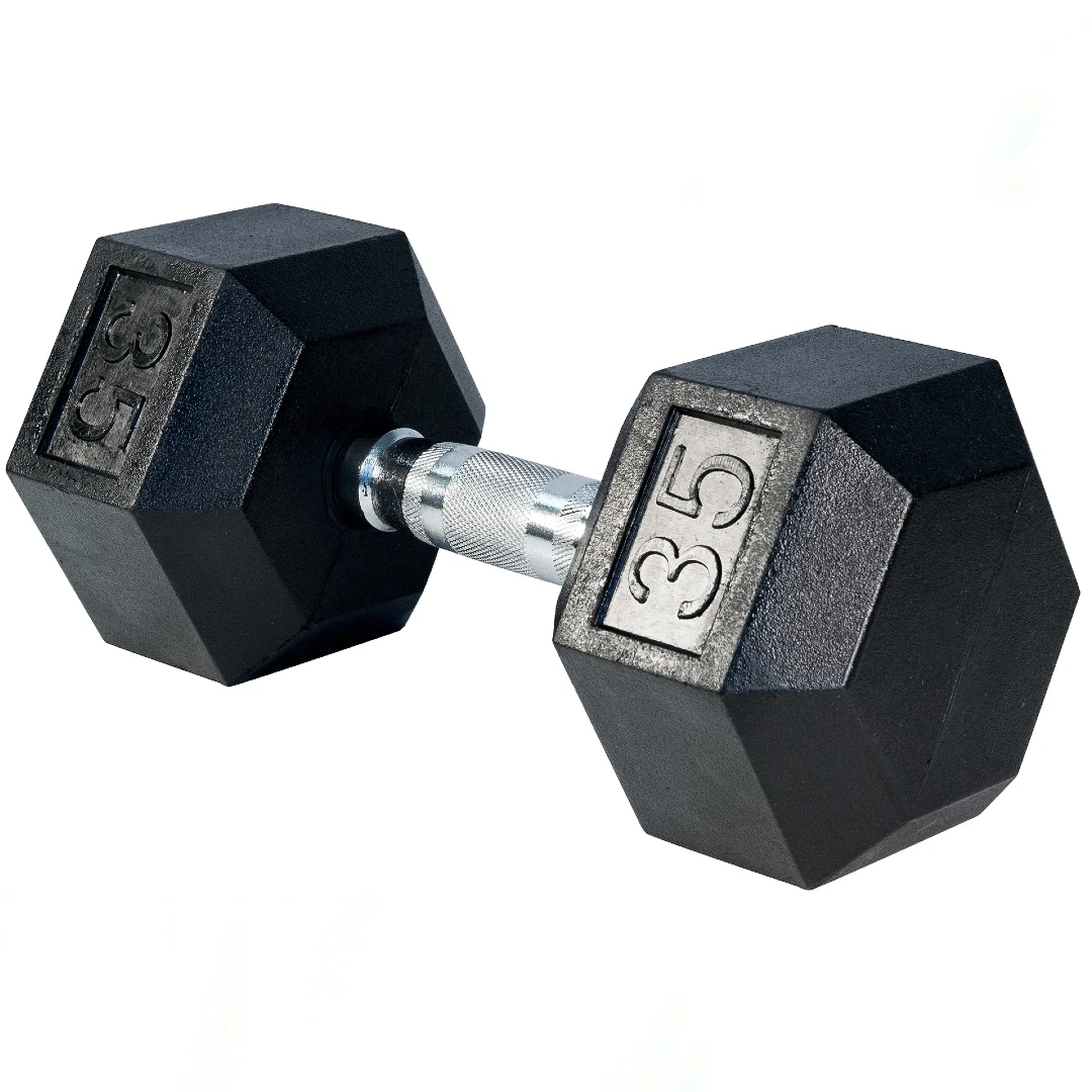 These safe, attractive dumbbells have contoured, knurled chrome handles and durable rubber-covered heads for increased safety and comfort. The heads are torque-threaded and permanently affixed to a thick 35 mm solid steel shaft improving the strength of the head/handle joint. The knurled chrome handles are ergonomically contoured to fit comfortably in the users palm. Smaller handles graduate up from 25 mm grip to 35 mm grip for increments 20 lbs. through 125lbs. The rubber coating increases durability, protects flooring and equipment, enhances appearance, diminishes noise and is easy to clean.