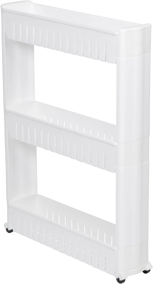 Use the sliding storage tower as a space saver in the bathroom, laundry room, kitchen or anyplace where you need extra storage. This unit easily slides between cabinets, appliances and bookcases. Perfect for small spaces where storage is at a premium. Easy assembly required. By Trademark Innovations.