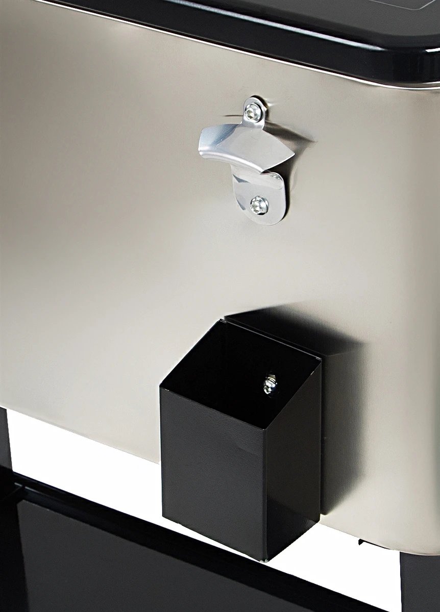 Make entertaining easy with this 77 quart stainless steel cooler. Â It measures 31″L x 15.3″W x 33″H and weighs 40lbs. Â It has rolling casters to easily maneuver. Â Convenient storage shelf on the bottom and a bottle opener on the side. Â Durable plastic inner lining keeps drinks and food cold for hours. Â Use on the patio, deck or in the yard for your next party. Â By Trademark Innovations.